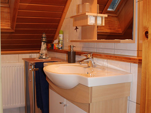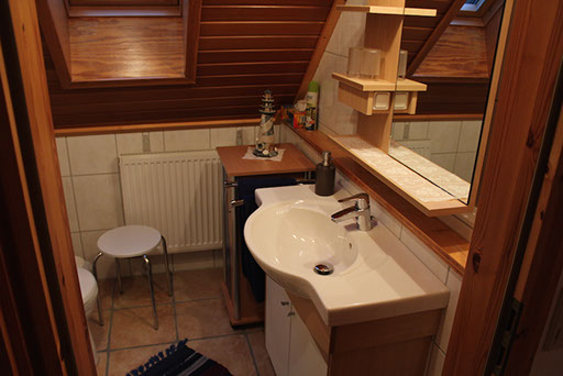 Klein, aber stilvoll eingerichtet ist das Badezimmer der Ferienwohnung.