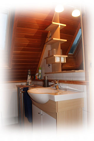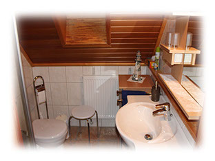 Klein, aber stilvoll eingerichtet ist das Badezimmer der Ferienwohnung. Inklusive Dusche, WC, Waschgelegenheit mit Fön, Handtücher und als Ablage dazu einen Badehocker.