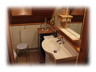 Klein, aber stilvoll eingerichtet ist das Badezimmer der Ferienwohnung.